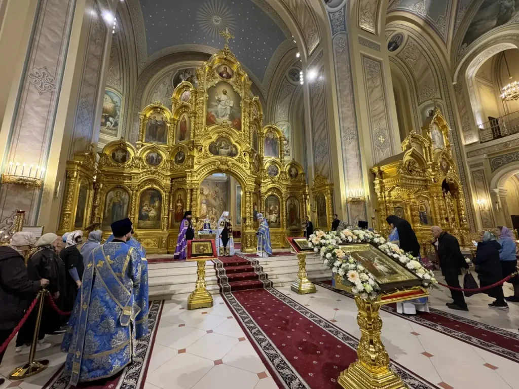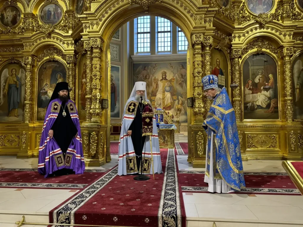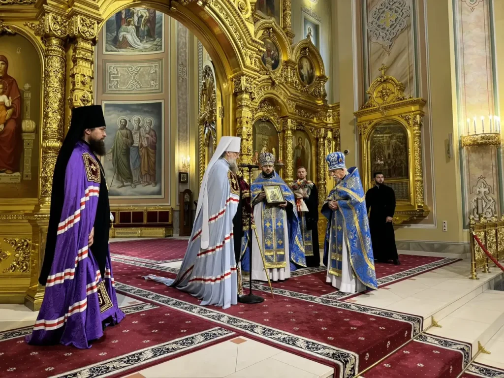 Далее владыка митрополит преподнес протоиерею Николаю Урывскому в дар на молитвенную память икону Божией Матери «Одигитрия».