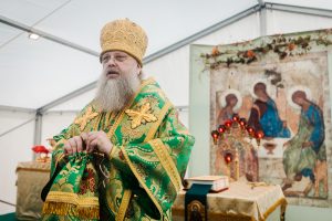 Помню, как мы писали прошение Святейшему Патриарху, и надежда получить благословение на принесение святыни была очень мала. Тогда я обратился к владыке Феогносту, который на тот момент был наместником Троице-Сергиевой лавры, с просьбой о молитве. Вскоре пришла утвердительная резолюция, и часть мощей была передана в нашу епархию. Икона преподобного Сергия, хранящаяся ныне в храме, была освящена у его мощей. И сам храм, который возводится на этом месте, является точной архитектурной копией Троицкого собора Троице-Сергиевой лавры, где почивают святые мощи преподобного Сергия Радонежского.