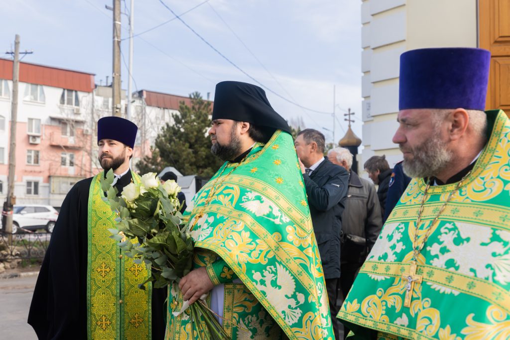 Его Высокопреосвященству сослужили благочинный Таганрогского округа иерей Борис Гущин, настоятель Никольского храма города Таганрога, председатель комиссии по канонизации святых Донской митрополии иеромонах Маврикий (Звягинцев), секретарь Епархиального управления Ростовской-на-Дону епархии иерей Димитрий Болотаев, руководитель Епархиального отдела по взаимодействию с казачеством протоиерей Георгий Сморкалов, наместник Донского Старочеркасского Ефремовского мужского монастыря игумен Сергий (Коломиц), клирики епархии.