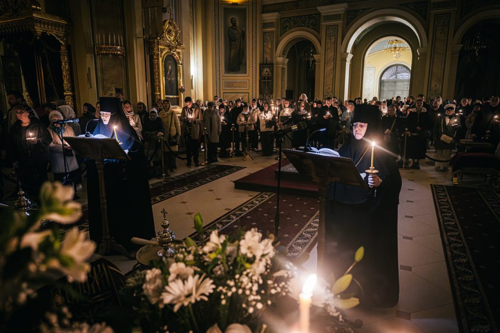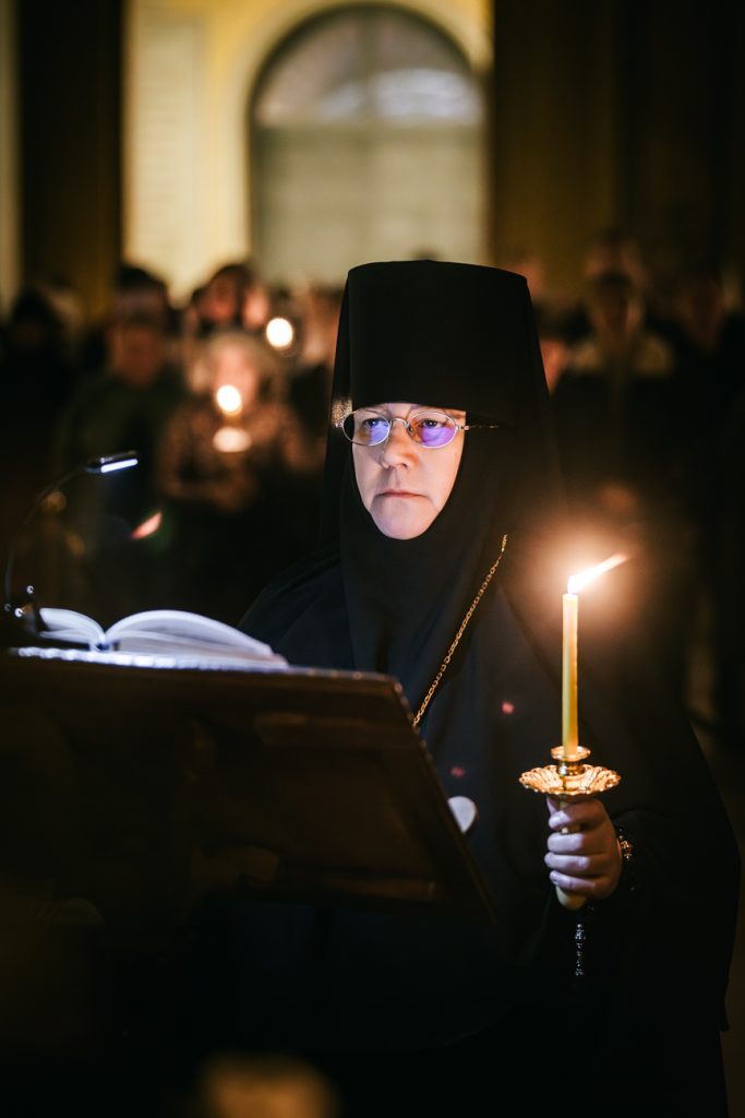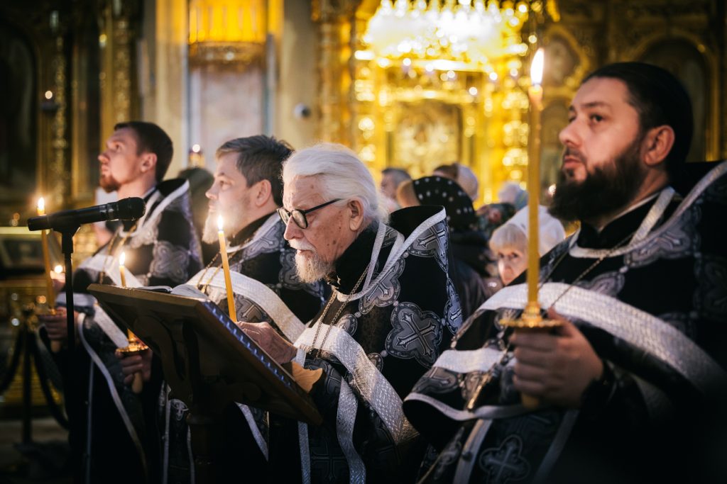 После пения тропарей на «Бог Господь» клирики собора прочитали перед Плащаницей Спасителя «Непорочны» – стихи 17-й кафизмы, с краткими песнопениями или «похвалами».