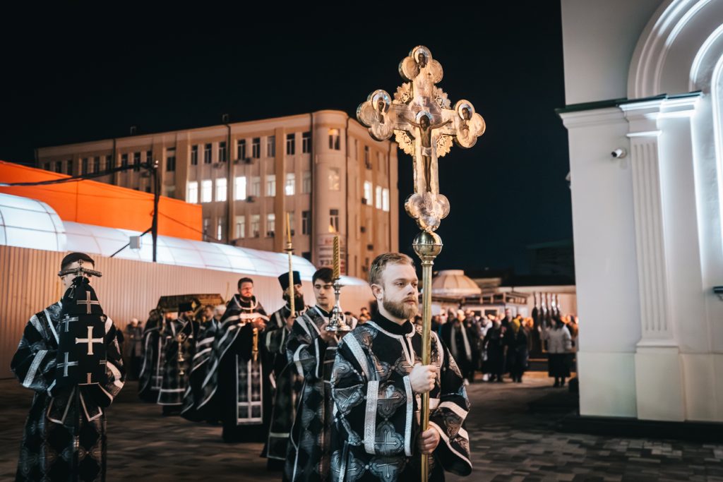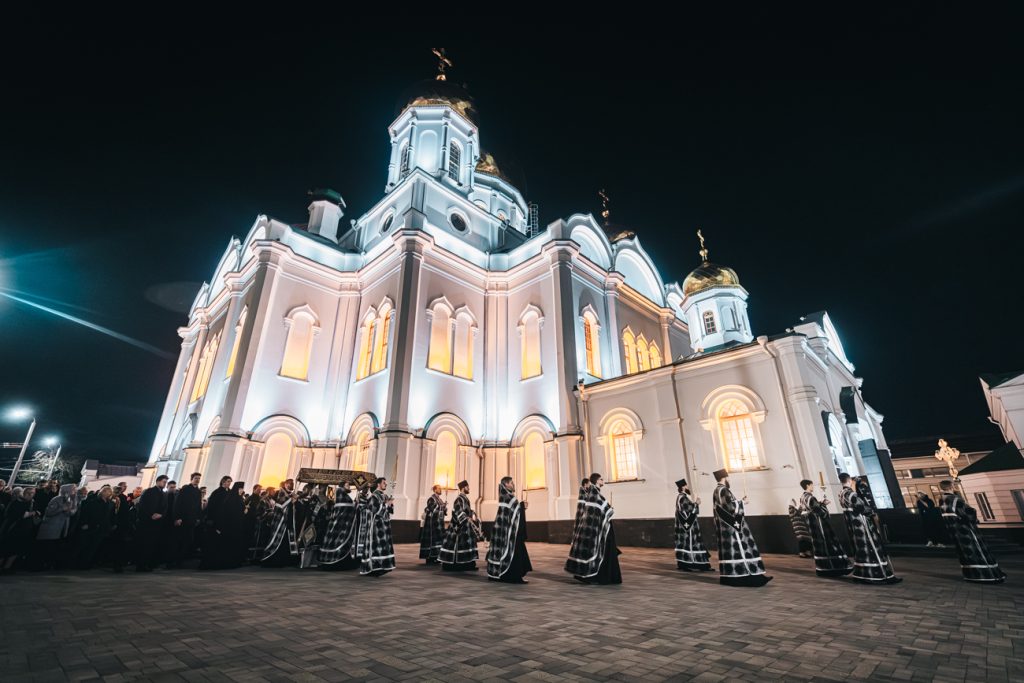 10 апреля 2026 года, в канун Великой Субботы, Глава Донской митрополии митрополит Ростовский и Новочеркасский Меркурий совершил утреню с чином погребения Плащаницы Господа нашего Иисуса Христа в Кафедральном соборе Рождества Пресвятой Богородицы города Ростова-на-Дону.