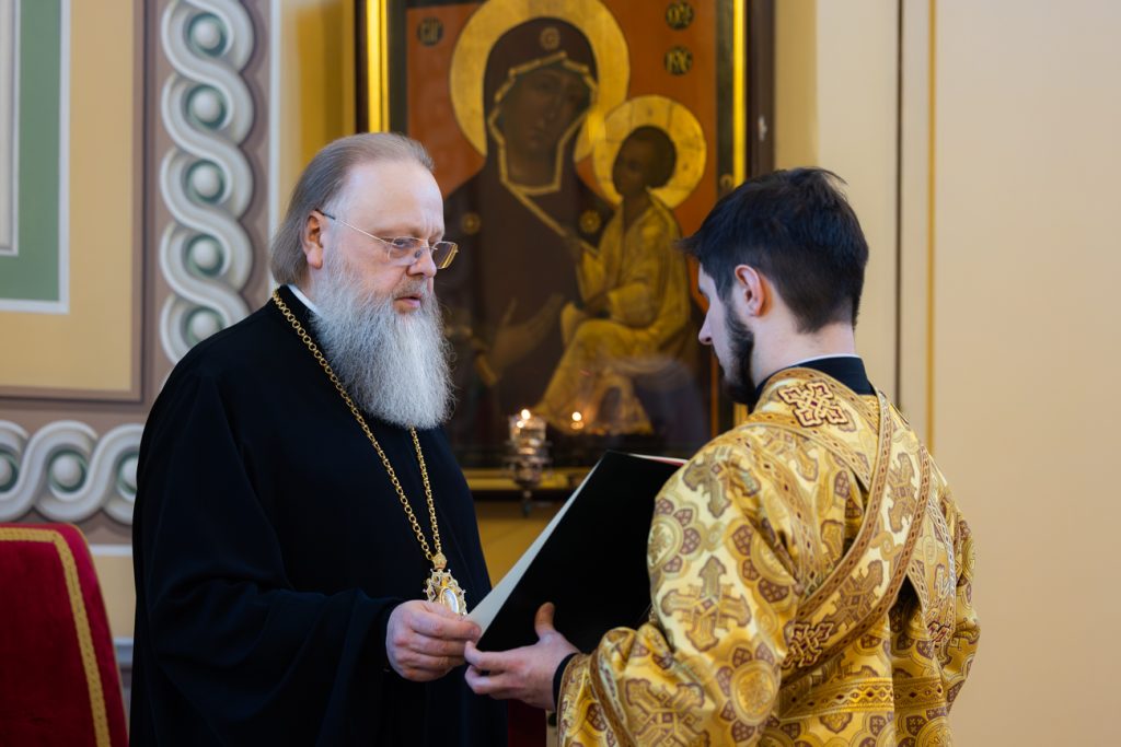 По окончании полиелея владыка митрополит совершил постриг во чтеца и поставление в иподиакона студента 1 курса Донской духовной семинарии, штатного алтарника Кафедрального собора Рождества Пресвятой Богородицы Павла Иголкина.