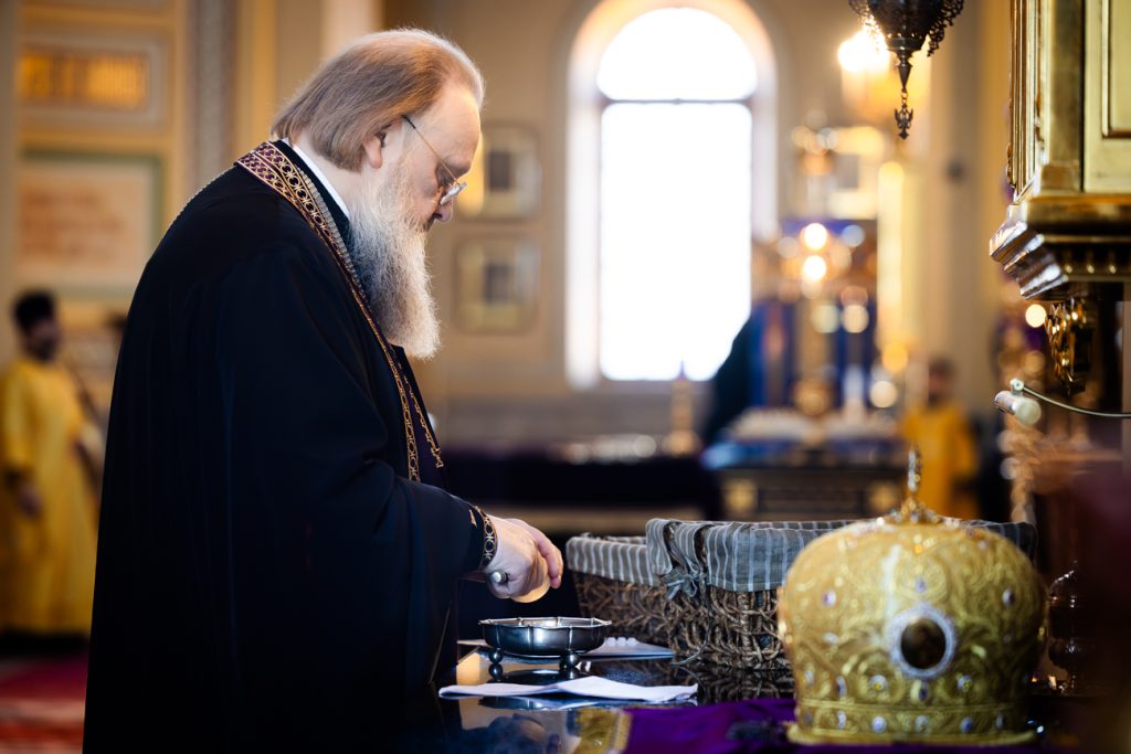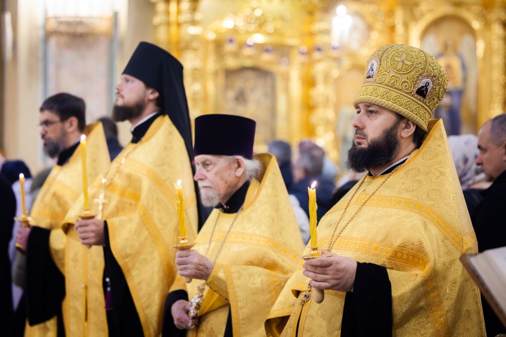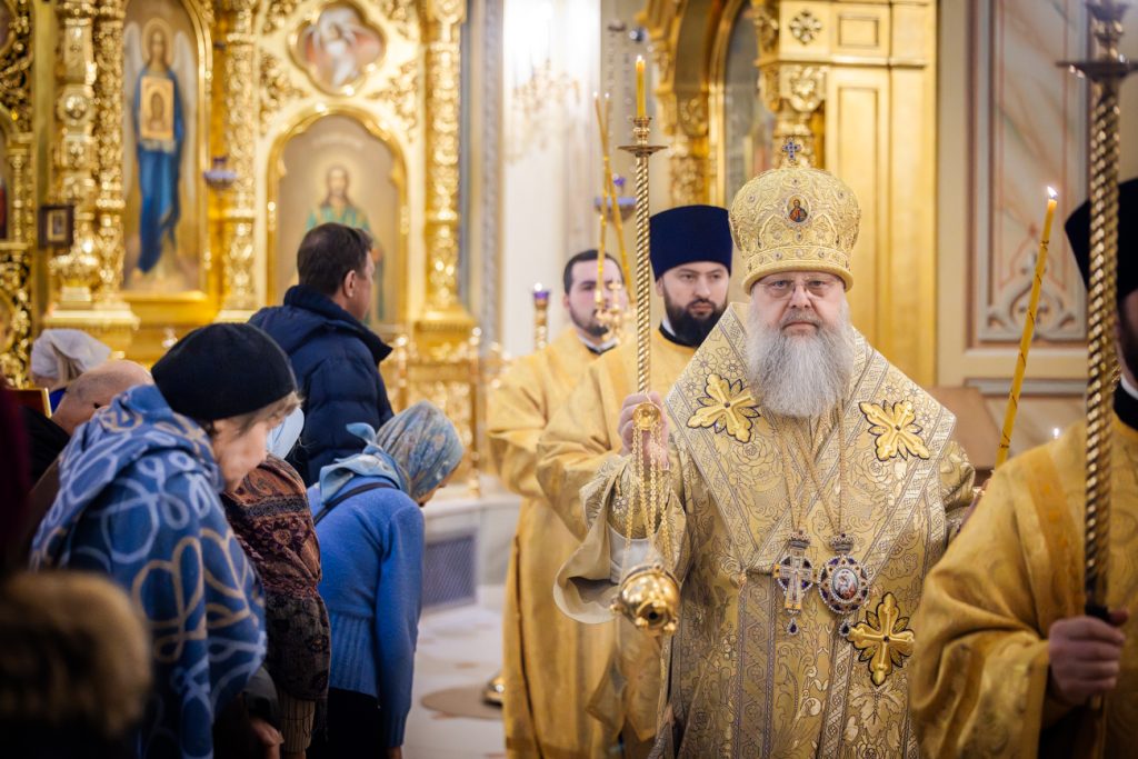 Его Высокопреосвященству сослужили председатель приходского совета собора протоиерей Александр Брянцев, настоятель собора иерей Димитрий Болотаев, духовник епархии протоиерей Николай Урывский и клирики собора.