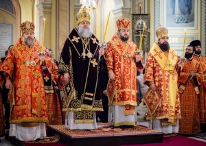 Его Высокопреосвященству сослужили епископ Шахтинский и Миллеровский Симон, епископ Волгодонский и Сальский Антоний, викарий Ростовской епархии епископ Таганрогский Артемий, председатель приходского совета собора протоиерей Александр Брянцев, настоятель собора иерей Димитрий Болотаев, духовник епархии протоиерей Николай Урывский, личный секретарь Главы Донской митрополии иерей Сергий Грибов, клирики собора.