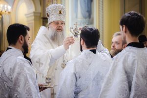 Его Высокопреосвященству сослужили настоятель собора иерей Димитрий Болотаев, духовник епархии протоиерей Николай Урывский, личный секретарь Главы Донской митрополии иерей Сергий Грибов, клирики собора.