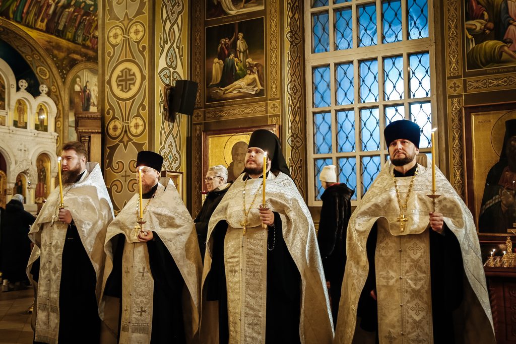 Его Преосвященству сослужили настоятель Преполовенского храма, проректор по воспитательной работе Донской духовной семинарии иерей Андрей Миронов, заведующий отделением магистратуры Донской духовной семинарии протоиерей Григорий Гриднев, заведующий регентско-певческим отделением Донской духовной семинарии иеромонах Аверкий (Шапошников) и клирики храма.