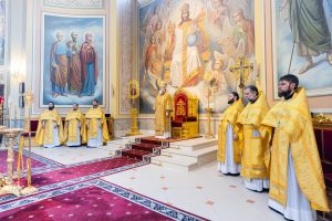 Его Высокопреосвященству сослужили председатель приходского совета собора протоиерей Александр Брянцев, настоятель собора иерей Димитрий Болотаев, клирики храма.