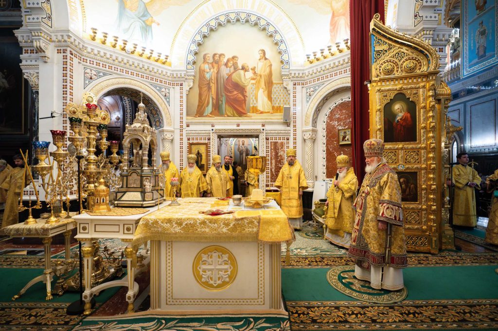 За Литургией Его Святейшеству сослужили: митрополит Ташкентский и Узбекистанский Викентий, глава Среднеазиатского митрополичьего округа; митрополит Минский и Заславский Вениамин, Патриарший экзарх всея Беларуси; митрополит Воскресенский Григорий, управляющий делами Московской Патриархии, первый викарий Патриарха Московского и всея Руси по г. Москве; митрополит Владимирский и Суздальский Никандр, председатель Финансово-хозяйственного управления Московского Патриархата; митрополит Тульский и Ефремовский Алексий; митрополит Липецкий и Задонский Арсений; митрополит Екатеринбургский и Верхотурский Евгений, председатель Синодального отдела религиозного образования и катехизации, председатель Оргкомитета Международных Рождественских образовательных чтений; митрополит Луганский и Алчевский Пантелеимон; митрополит Саранский и Мордовский Зиновий; митрополит Архангельский и Холмогорский Корнилий; митрополит Смоленский и Дорогобужский Исидор; митрополит Ханты-Манссийский и Сургутский Павел; митрополит Читинский и Петровск-Забайкальский Димитрий; митрополит Хабаровский и Приамурский Артемий; митрополит Донецкий и Мариупольский Владимира; митрополит Самарский и Новокуйбышевский Феодосий; сонм архиереев Русской Православной Церкви, прибывших на Международные Рождественские чтения.