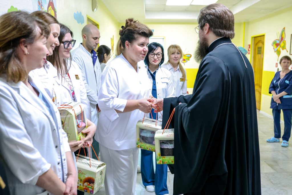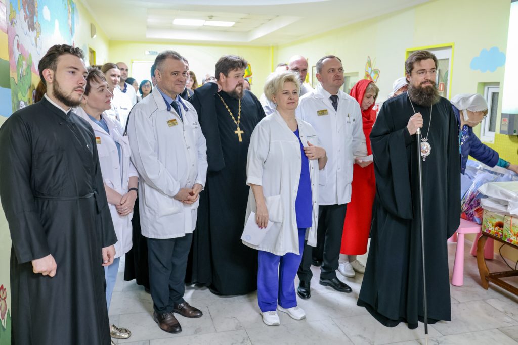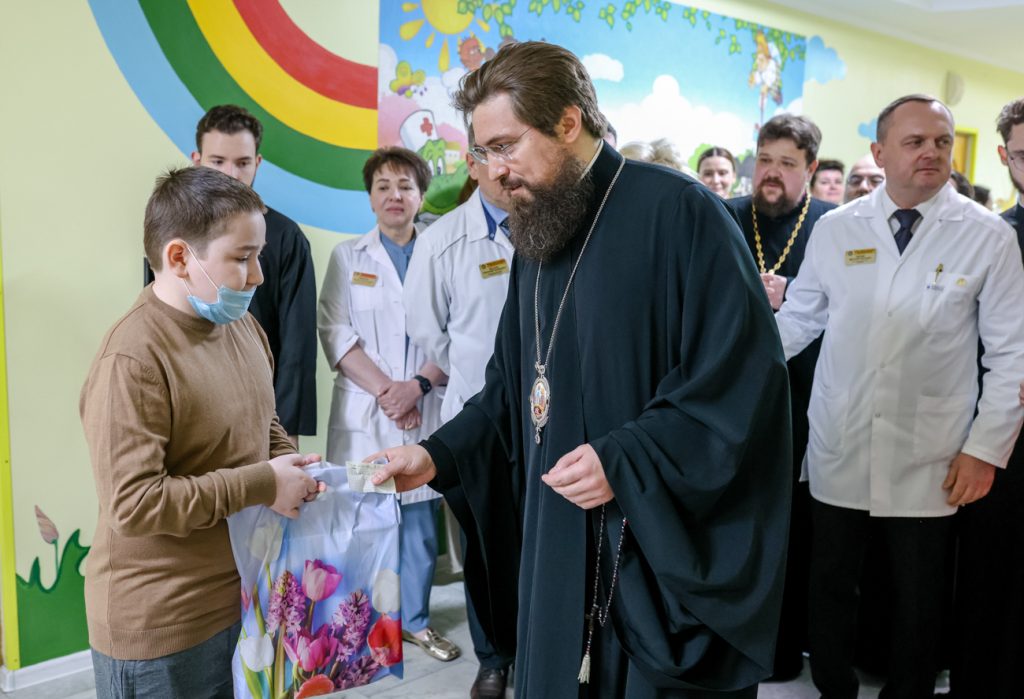 Затем, в сопровождении администрации и сотрудников института епископ Артемий посетил отделение детской онкологии. Его Преосвященство поздравил находящихся на лечении детей и их родителей, врачей и сотрудников отделения с праздником Пасхи Господней и преподнес им пасхальные подарки.