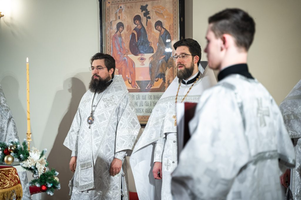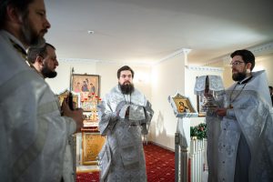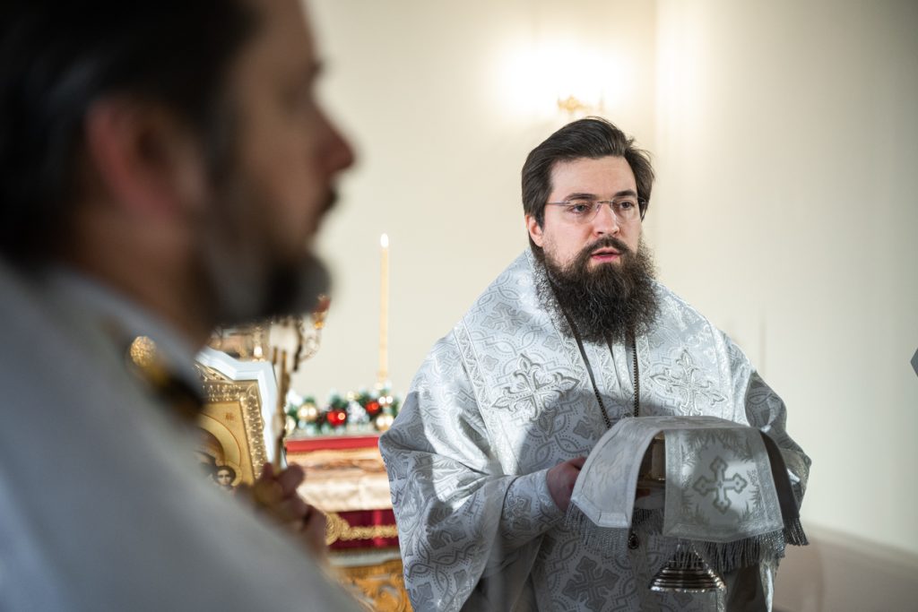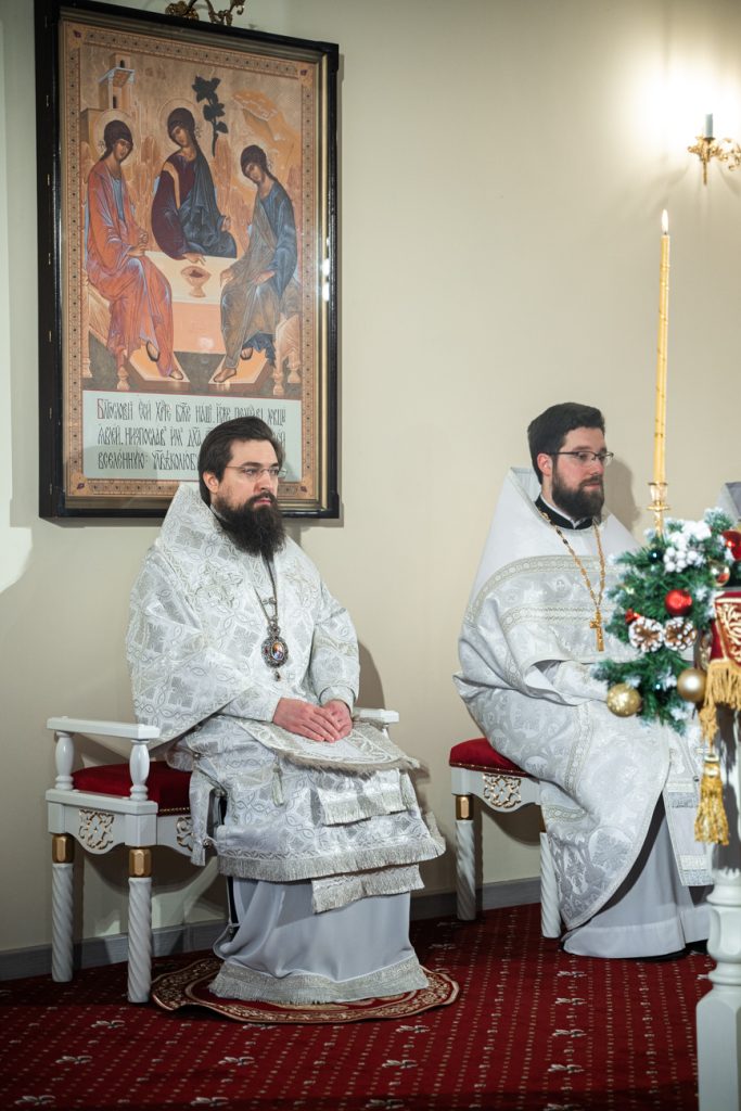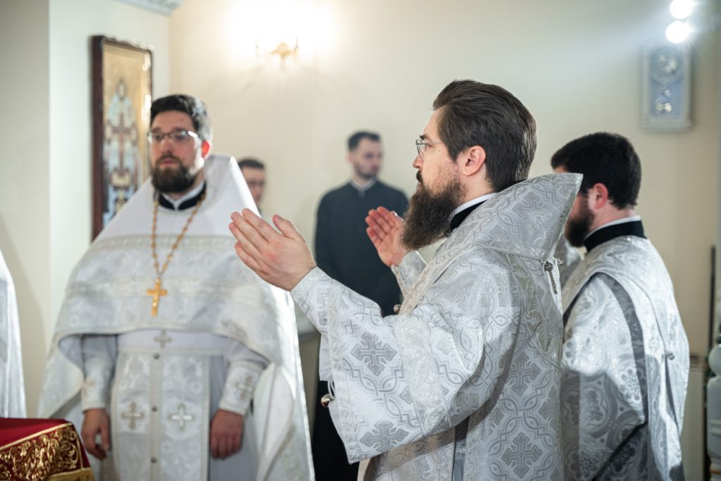 Его Преосвященству сослужили настоятель домового храма, проректор по учебной работе Донской духовной семинарии иерей Олег Малышев, проректор по воспитательной работе Донской духовной семинарии иерей Андрей Миронов и клирики Преполовенского храма.