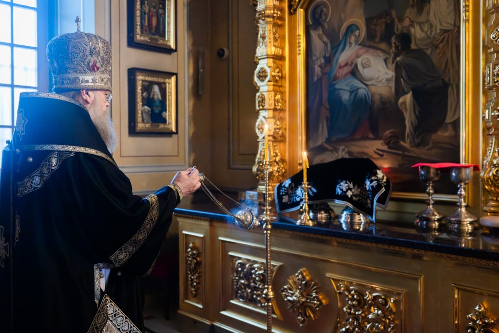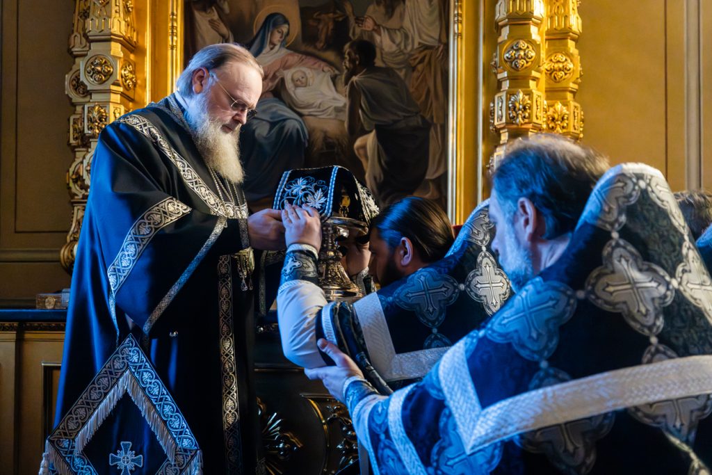 Его Высокопреосвященству сослужили председатель приходского совета собора протоиерей Александр Брянцев, настоятель собора иерей Димитрий Болотаев, духовник епархии протоиерей Николай Урывский, а также духовенство собора.