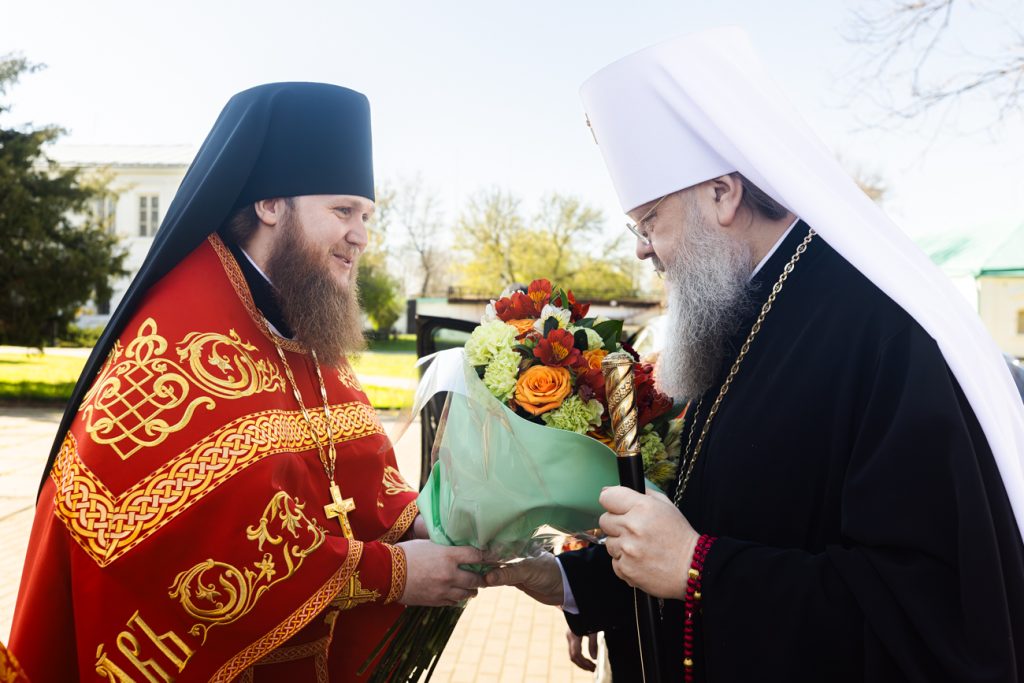 Со словом приветствия к владыке митрополиту обратился наместник Донского Старочеркасского Ефремовского мужского монастыря игумен Сергий (Коломиц). Он поблагодарил священноархимандрита Старочеркасской обители за совместную молитву и преподнес Его Высокопреосвященству пасхальное яйцо.