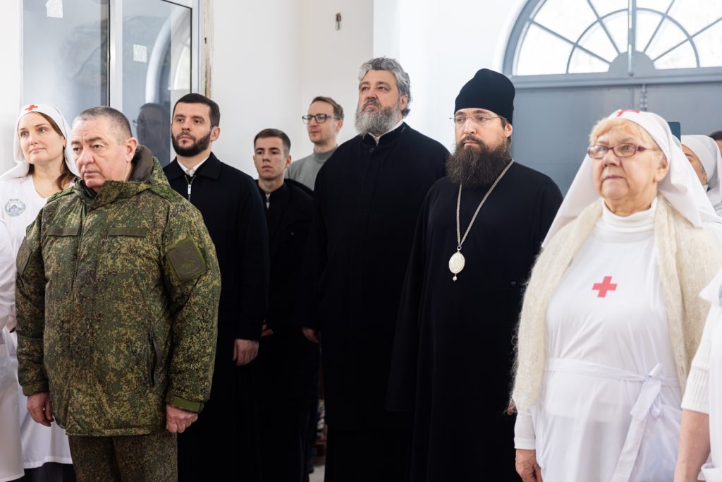За богослужением молились начальник госпиталя Валерий Кокоев, викарий Ростовской епархии епископ Таганрогский Артемий, настоятель госпитального храма святителя Луки иерей Димитрий Мягков, руководитель отдела по взаимодействию с Вооруженными силами и правоохранительными учреждениями Ростовской епархии протоиерей Валерий Волощук, секретарь епархиального управления иерей Димитрий Болотаев, руководитель епархиального отдела по церковной благотворительности и социальному служению иерей Евгений Осяк, руководитель протокола Главы Донской митрополии иерей Владимир Осяк, сестры милосердия.