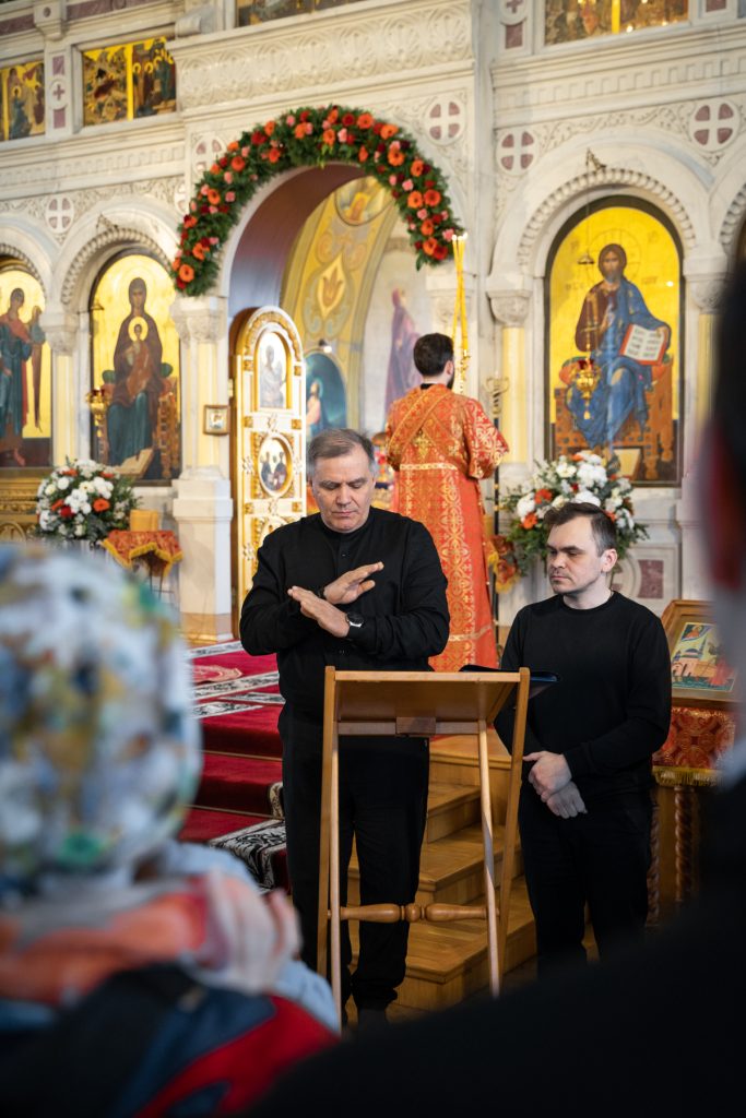 Владыка Артемий отметил особую помощь Всероссийского общества глухих и подготовленных священнослужителей, которые смогли донести слова и смысл Литургии до всех присутствующих в храме.