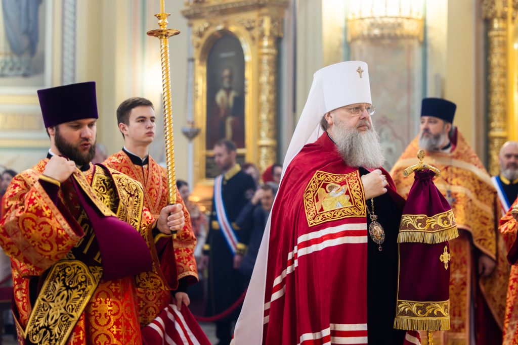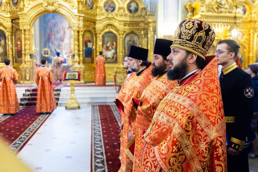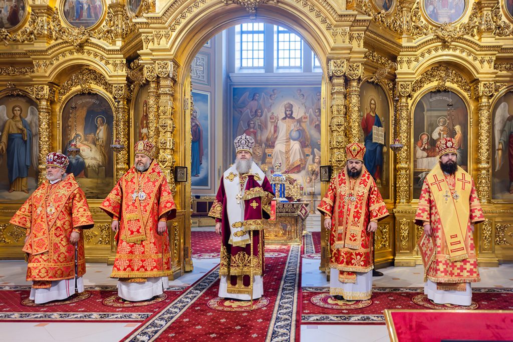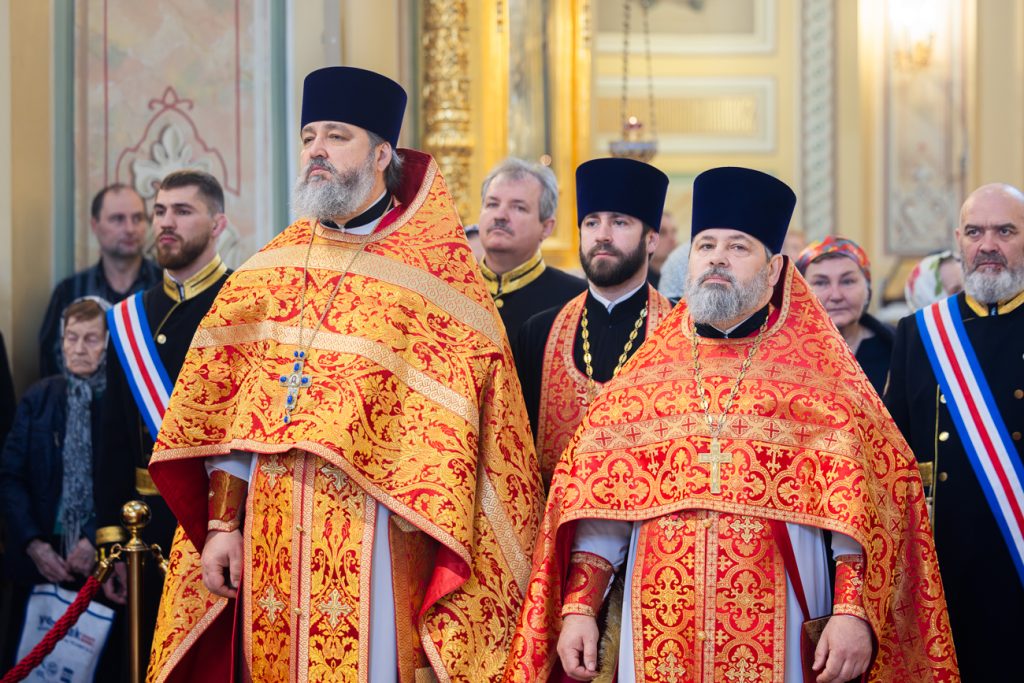 Его Высокопреосвященству сослужили епископ Волгодонский и Сальский Антоний, епископ Шахтинский и Миллеровский Симон, викарий Ростовской епархии епископ Таганрогский Артемий, епископ Пармен (Щипелев), председатель приходского совета собора протоиерей Александр Брянцев, настоятель собора иерей Димитрий Болотаев, руководитель Епархиального отдела по взаимодействию с казачеством протоиерей Георгий Сморкалов, руководитель Епархиального отдела по взаимодействию с Вооруженными Силами и правоохранительными учреждениями протоиерей Валерий Волощук, а также духовенство Донской митрополии.
