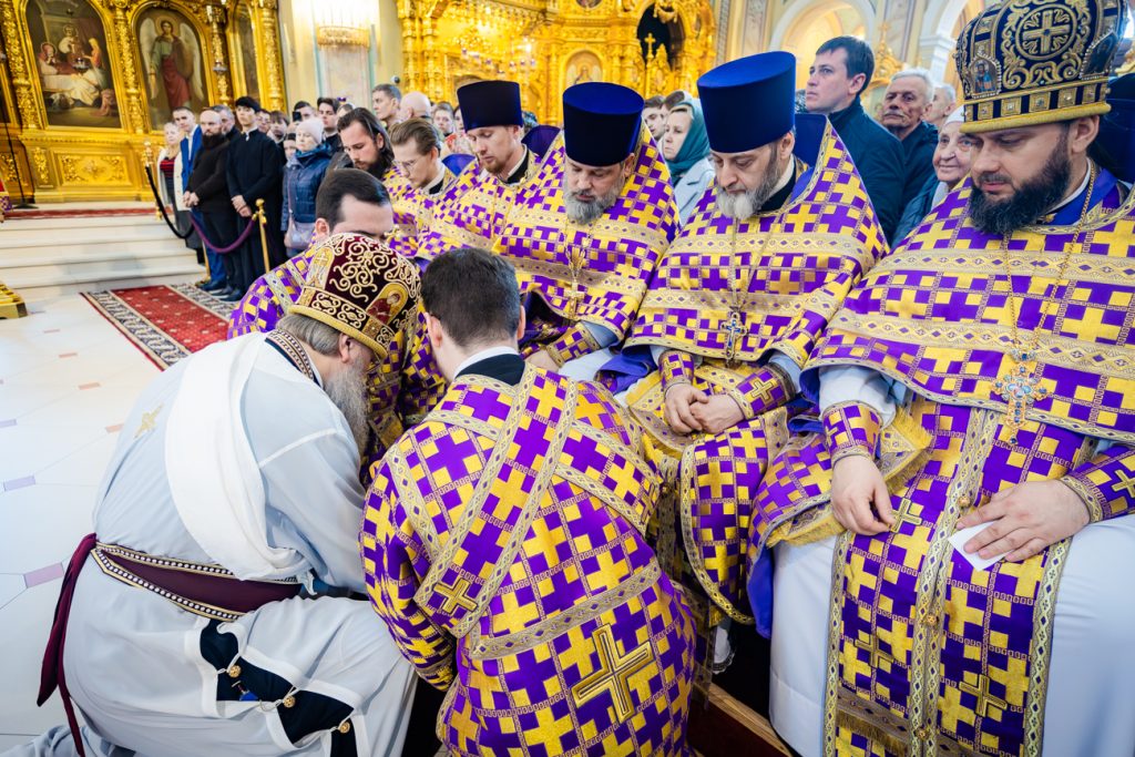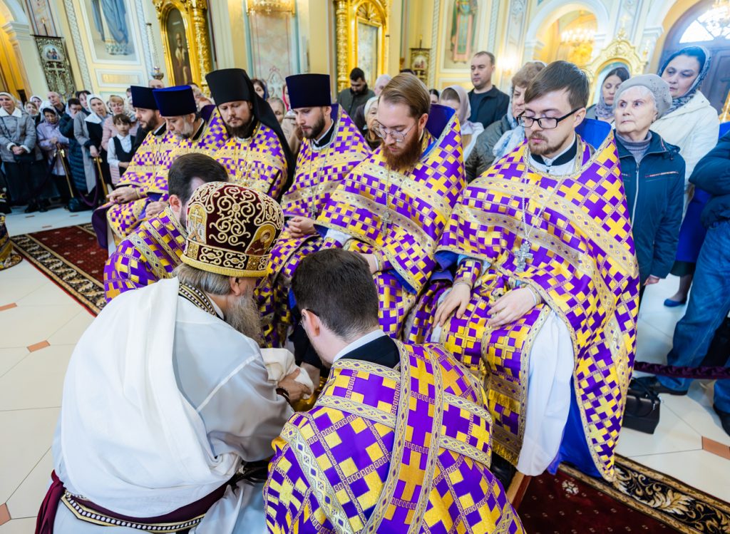 По окончании богослужения был совершен древний чин умовения ног. По образу Христа, умывшего ноги Своим ученикам-апостолам за Тайной Вечерей, Высокопреосвященнейший владыка умыл в храме ноги двенадцати священникам в знак глубокого смирения и служения народу Божию.