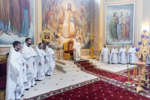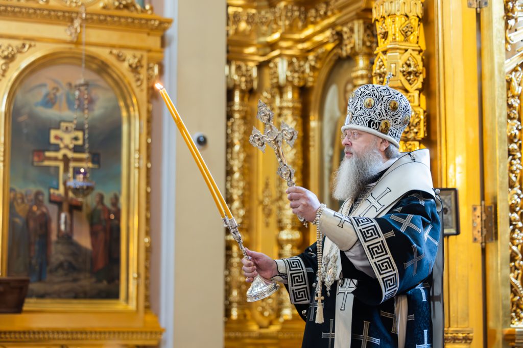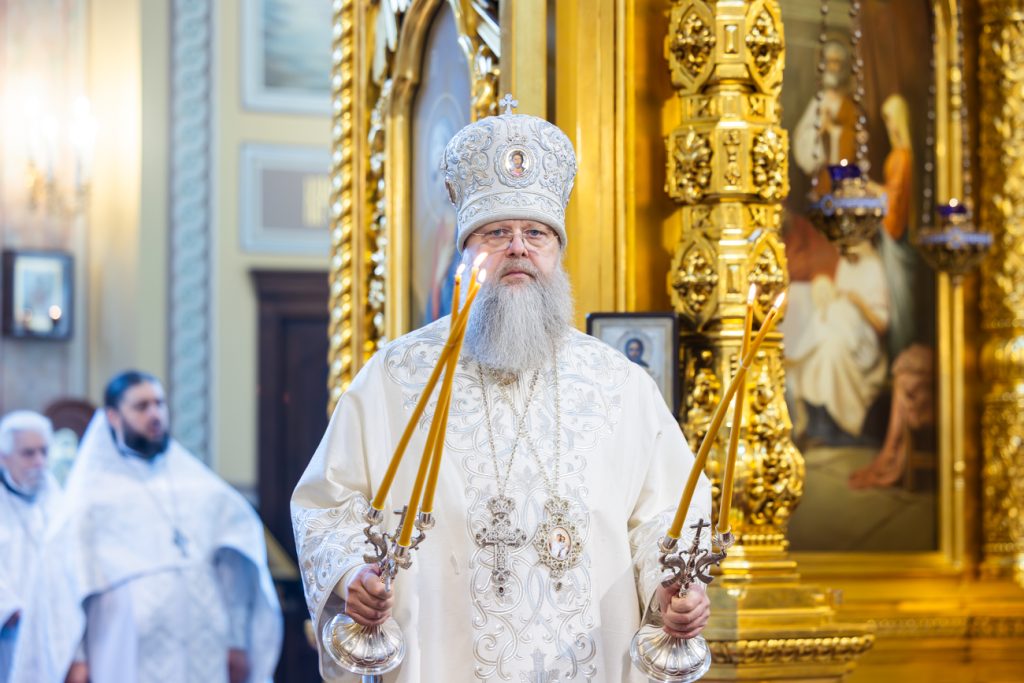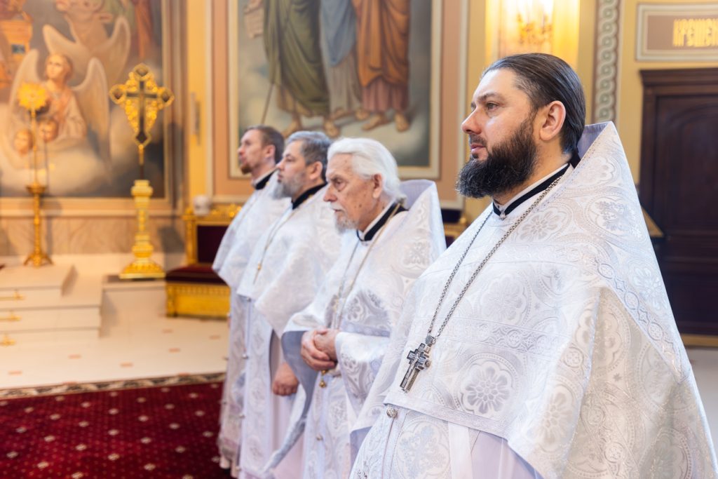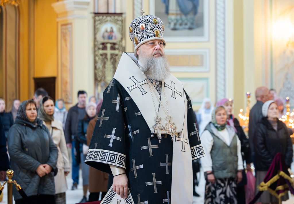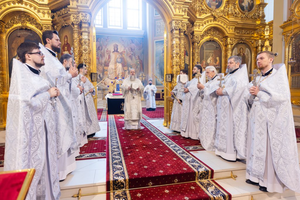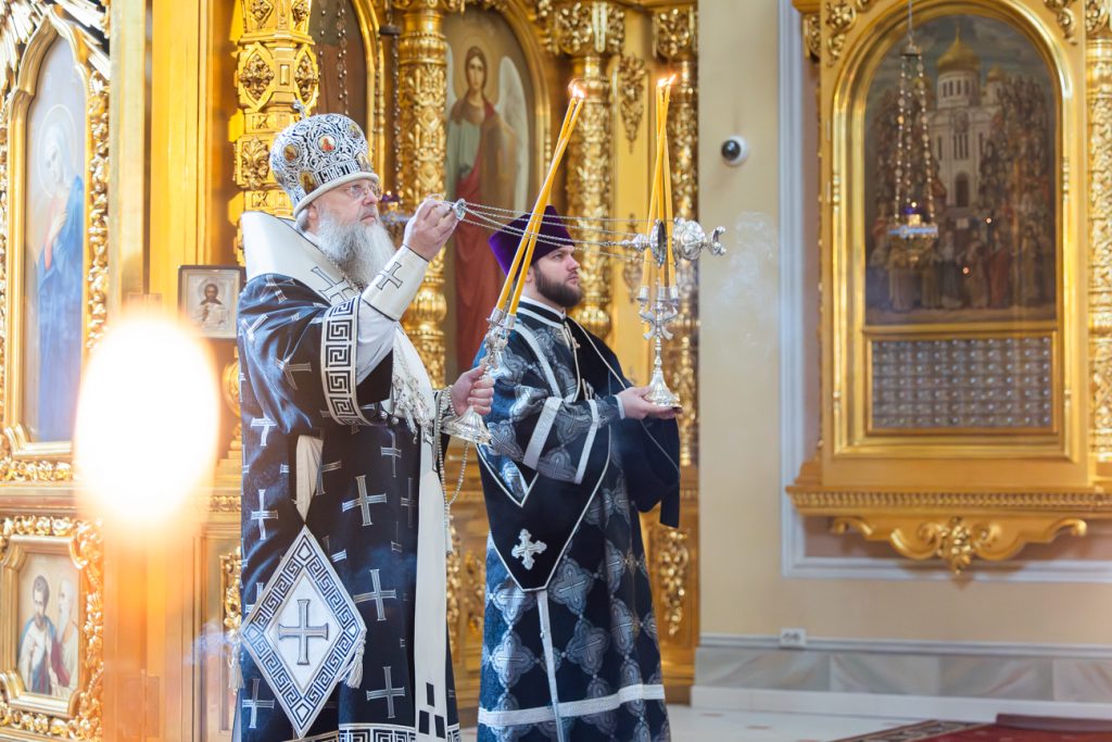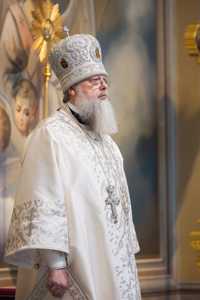 Его Высокопреосвященству сослужили председатель приходского совета собора протоиерей Александр Брянцев, настоятель собора иерей Димитрий Болотаев, духовник епархии протоиерей Николай Урывский и клирики собора.