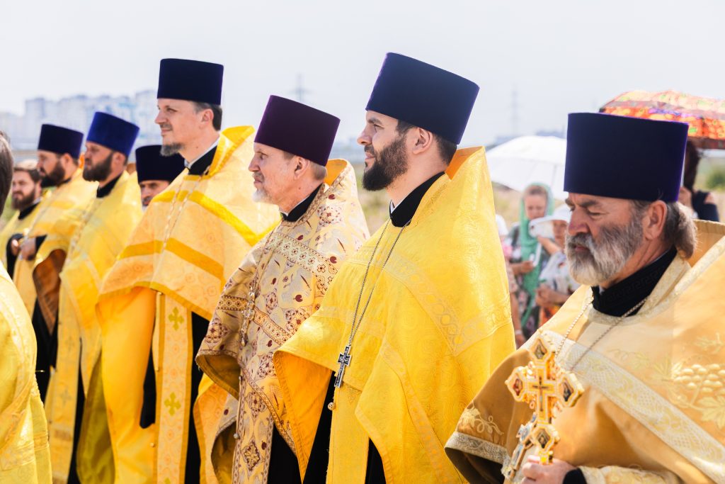 Его Высокопреосвященству сослужили благочинный Юго-Западного округа, секретарь митрополита Ростовского и Новочеркасского города Ростова-на-Дону протоиерей Иоанн Осяк, настоятель строящегося храма иерей Антоний Лыга, секретарь Епархиального управления Ростовской-на-Дону епархии иерей Димитрий Болотаев, руководитель Епархиального отдела по взаимодействию с Вооруженными Силами и правоохранительными учреждениями протоиерей Валерий Волощук, наместник Донского Старочеркасского Ефремовского мужского монастыря игумен Сергий (Коломиц), руководитель Епархиального отдела по тюремному служению иерей Александр Кушнир, клирики епархии.