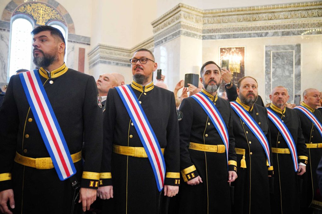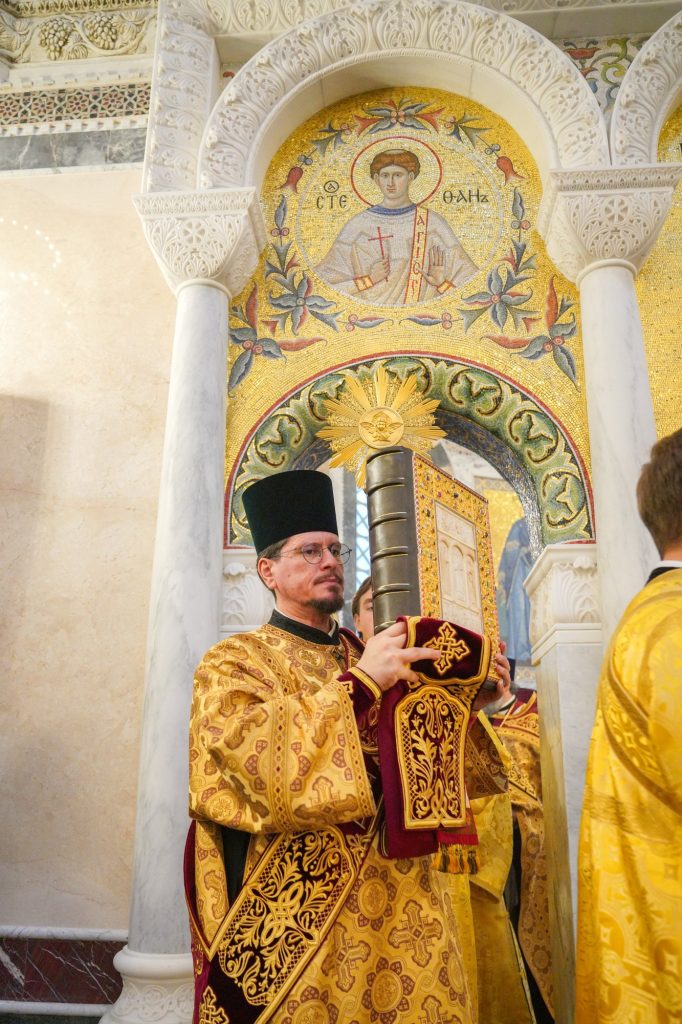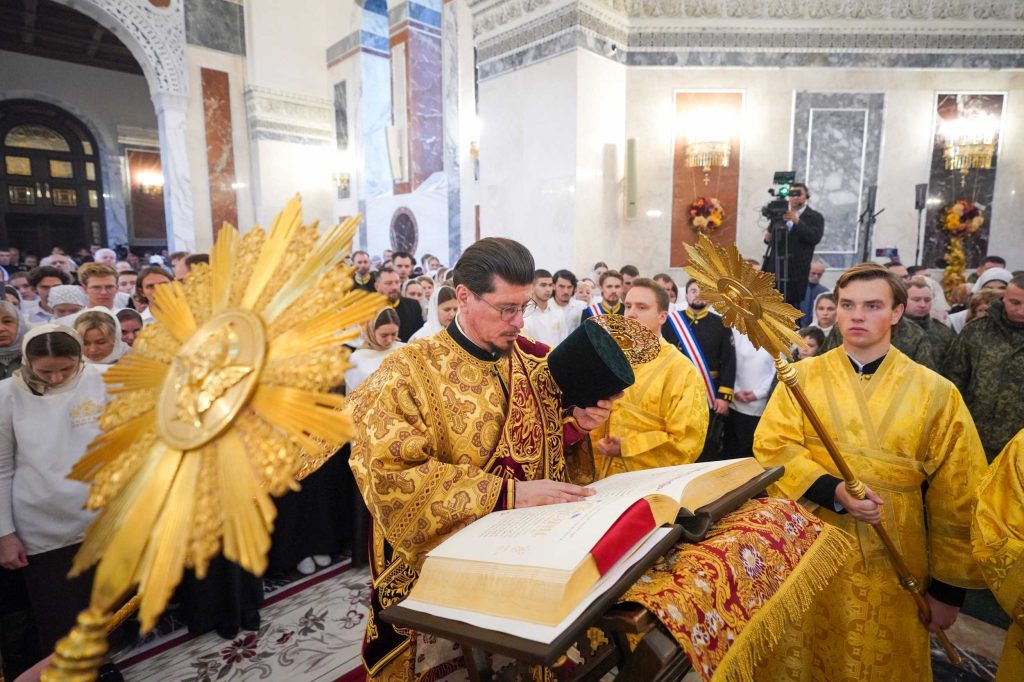 За Литургией Его Святейшеству сослужили: управляющий делами Московской Патриархии митрополит Воскресенский Григорий; митрополит Ростовский и Новочеркасский Меркурий; митрополит Ставропольский и Невинномысский Кирилл, председатель Синодального отдела по взаимодействию с Вооруженными силами и правоохранительными органами, председатель Синодального комитета по взаимодействию с казачеством; митрополит Донецкий и Мариупольский Владимир; епископ Волгодонский и Сальский Антоний; епископ Шахтинский и Миллеровский Симон; епископ Таганрогский Артемий, викарий Ростовской епархии; епископ Раменский Алексий, личный секретарь Святейшего Патриарха Кирилла; протоиерей Иоанн Осяк, секретарь митрополита Ростовского и Новочеркасского по г. Ростову-на-Дону, благочинный Юго-Западного церковного округа г. Ростова-на-Дону; протоиерей Валерий Волощук, настоятель новоосвященного храма, помощник командующего войсками ЮВО по работе с верующими военнослужащими; протоиерей Георгий Сморкалов, настоятель Патриаршего Вознесенского войскового всеказачьего собора г. Новочеркасска Ростовской области, войсковой священник ВКО «Всевеликое войско Донское»; протоиерей Тимофей Фетисов, ректор Донской духовной семинарии, настоятель Троицкого храма г. Таганрога; протоиерей Димитрий Василенков, заместитель председателя Синодального отдела по взаимодействию с Вооруженными силами и правоохранительными органами, главный военный священник духовенства, окормляющий военнослужащих Вооруженных сил России и сотрудников иных силовых структур в зоне проведения СВО; игумен Сергий (Коломиц), наместник Донского Старочеркасского Ефремовского мужского монастыря; иерей Димитрий Болотаев, секретарь епархиального управления Ростовской епархии, настоятель кафедрального собора Рождества Пресвятой Богородицы г. Ростова-на-Дону; иерей Алексий Овчинников, проректор по научной работе Донской духовной семинарии; духовенство г. Москвы и Донской митрополии.