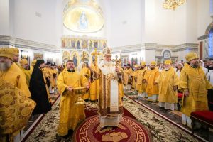 За Литургией Его Святейшеству сослужили: управляющий делами Московской Патриархии митрополит Воскресенский Григорий; митрополит Ростовский и Новочеркасский Меркурий; митрополит Ставропольский и Невинномысский Кирилл, председатель Синодального отдела по взаимодействию с Вооруженными силами и правоохранительными органами, председатель Синодального комитета по взаимодействию с казачеством; митрополит Донецкий и Мариупольский Владимир; епископ Волгодонский и Сальский Антоний; епископ Шахтинский и Миллеровский Симон; епископ Таганрогский Артемий, викарий Ростовской епархии; епископ Раменский Алексий, личный секретарь Святейшего Патриарха Кирилла; протоиерей Иоанн Осяк, секретарь митрополита Ростовского и Новочеркасского по г. Ростову-на-Дону, благочинный Юго-Западного церковного округа г. Ростова-на-Дону; протоиерей Валерий Волощук, настоятель новоосвященного храма, помощник командующего войсками ЮВО по работе с верующими военнослужащими; протоиерей Георгий Сморкалов, настоятель Патриаршего Вознесенского войскового всеказачьего собора г. Новочеркасска Ростовской области, войсковой священник ВКО «Всевеликое войско Донское»; протоиерей Тимофей Фетисов, ректор Донской духовной семинарии, настоятель Троицкого храма г. Таганрога; протоиерей Димитрий Василенков, заместитель председателя Синодального отдела по взаимодействию с Вооруженными силами и правоохранительными органами, главный военный священник духовенства, окормляющий военнослужащих Вооруженных сил России и сотрудников иных силовых структур в зоне проведения СВО; игумен Сергий (Коломиц), наместник Донского Старочеркасского Ефремовского мужского монастыря; иерей Димитрий Болотаев, секретарь епархиального управления Ростовской епархии, настоятель кафедрального собора Рождества Пресвятой Богородицы г. Ростова-на-Дону; иерей Алексий Овчинников, проректор по научной работе Донской духовной семинарии; духовенство г. Москвы и Донской митрополии.