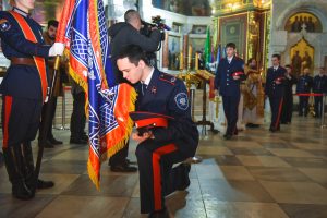 Перед началом церемонии участники молились за Божественной литургией, исповедались и причастились Святых Христовых Тайн. Молебен совершил войсковой священник Всевеликого войска Донского, духовник Платовской сотни ЮРГПУ (НПИ) им. М. И. Платова, настоятель Патриаршего Вознесенского войскового всеказачьего собора протоиерей Георгий Сморкалов.