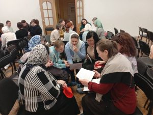 Во второй части занятия прошла работа по группам, в которых педагоги поделились опытом и разработали на основе пособия ЕУМК текущие тематические занятия в разных формах для своих приходских разновозрастных групп.