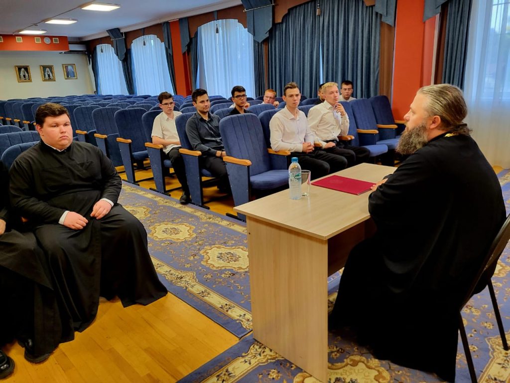 8 сентября 2025 года в актовом зале Донской духовной семинарии в рамках плана воспитательной работы состоялась встреча студентов Богословско-пастырского отделения очной формы обучения с духовником семинарии иеромонахом Никоном (Сандульским).