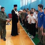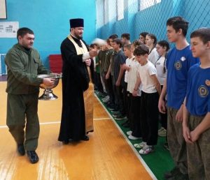 Затем к участникам обратился благочинный приходов Матвеево‑Курганского округа иерей Евгений Зайцев. Священник окропил присутствующих святой водой и произнес наставление, а также напомнил о нравственных ценностях, исторически важных для казачества.