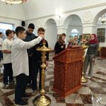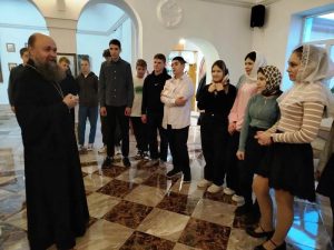 Настоятель храма иерей Виктор Нырков рассказал школьникам об истории храма и его устройстве, а также о существовании духовного мира, святых угодниках Божиих, изображенных на иконах, их житиях и о святости, к которой призван каждый православный христианин.